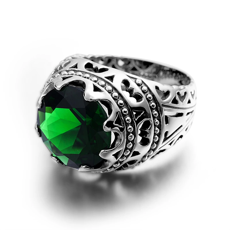 BEST Szjinao Genuine 925 Sterling Silver Rings Punk Vintage Style Green Emerald Semi-Precious Stones For